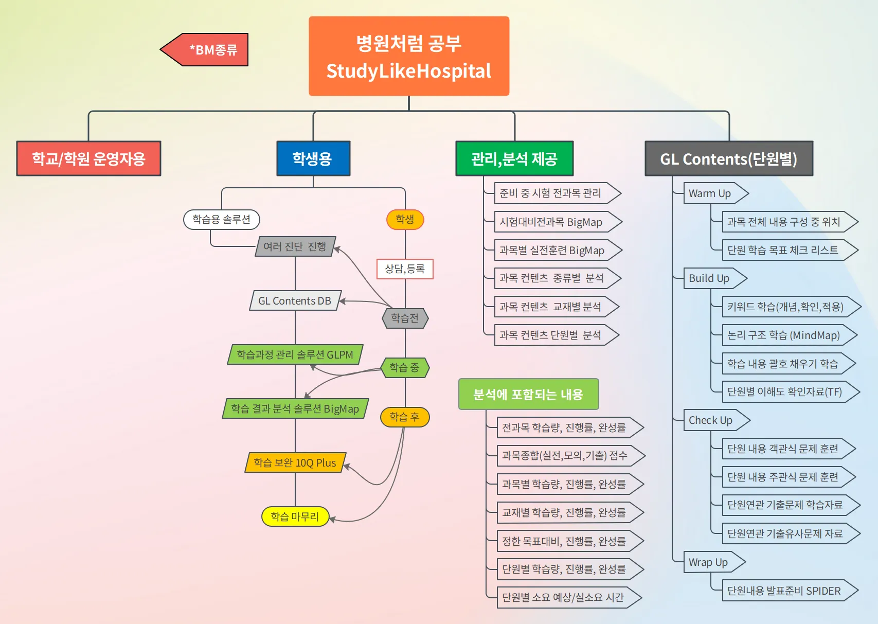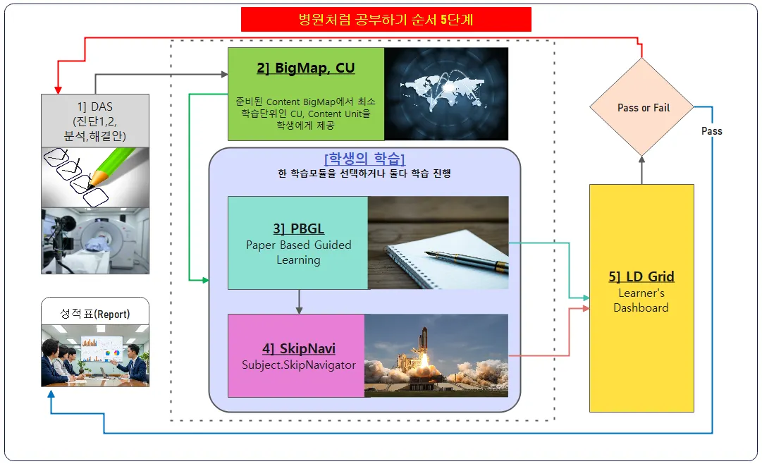 차량 출발전 네비게이션 경로 미리 다 보기에 비유 가능함. 마인드맵과 빅맵으로 학습 위치 파악과 진행 정도 확인, 해야 할 남은 공부 확인, 계획 수립 단계에 필요한 정보 등을 학습관리용 컴퓨터에서 선생님과 함께 보고 선생님 앞에서 또는 학생 단독으로 전체 단원, 내가 학습 해야 할 단원, 지금 하고 있는 공부, 오늘의 학습 계획, 학습 목표 등을 메모할 수 있는 양식지 제공