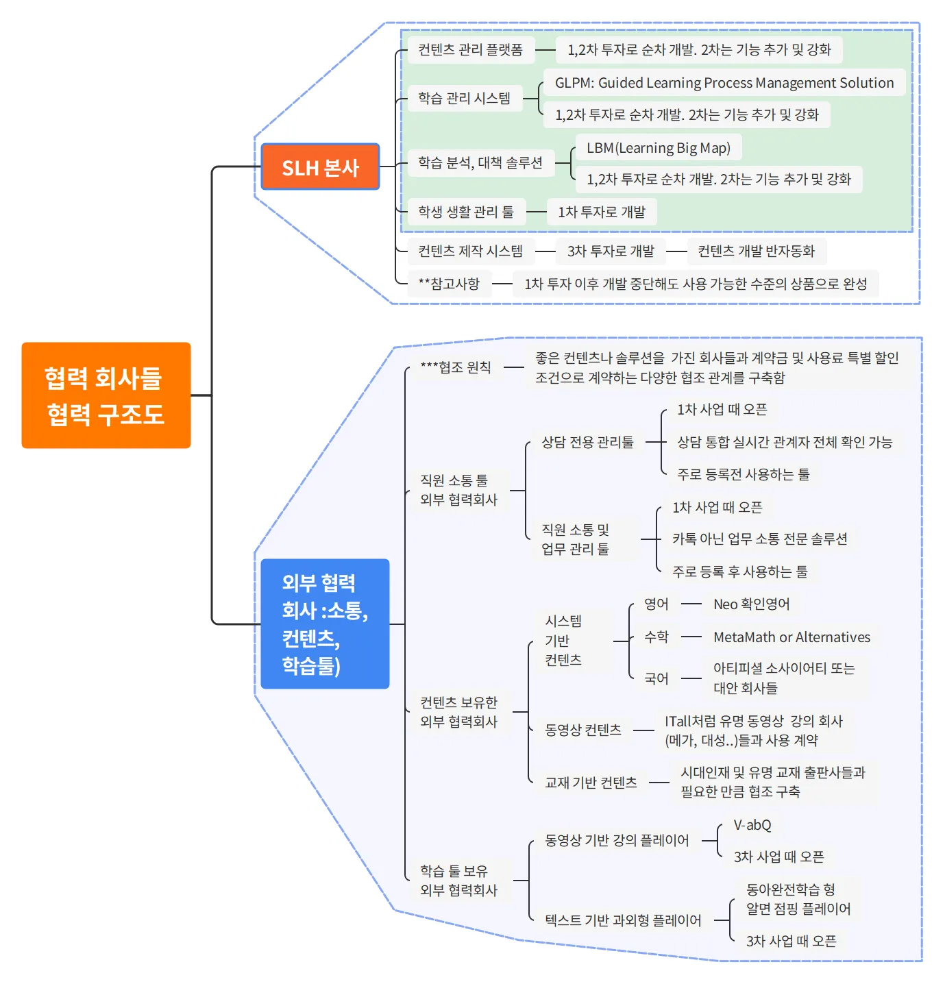 협력을 염두에 둔 외부 국영수 전문 회사: 국어(27억? 누적 투자받은 회사), 수학(시대인재가 주주이기도 한 2600개 학원이 사용중인 메타메쓰, 약 50억 누적 투자 받음. 연 2배 성장 중), 영어(확인영어사의 새로운 엔진과 컨텐츠 활용 예정).